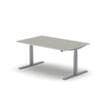 Platte aus Spanplatte mit pflegeleichter Melaminharzbeschichtung in Dekor MB White Grey. Plattenform rechteckig. T-Fußgestell in RAL9006 Weißaluminium. Höhenverstellung durch Elektromotor mit Handschalter. Mit Eurostecker.